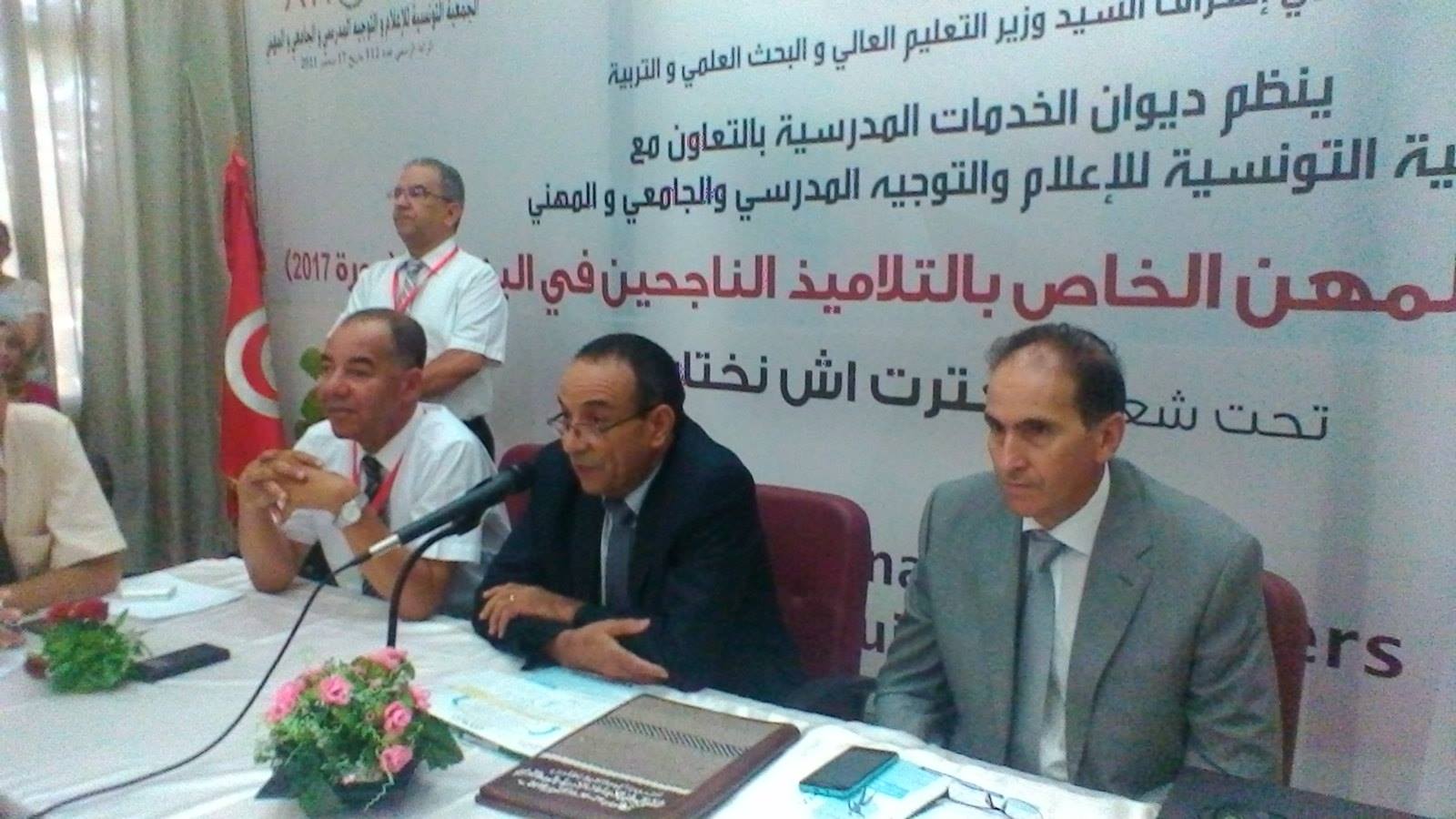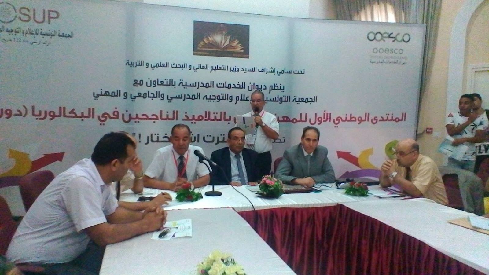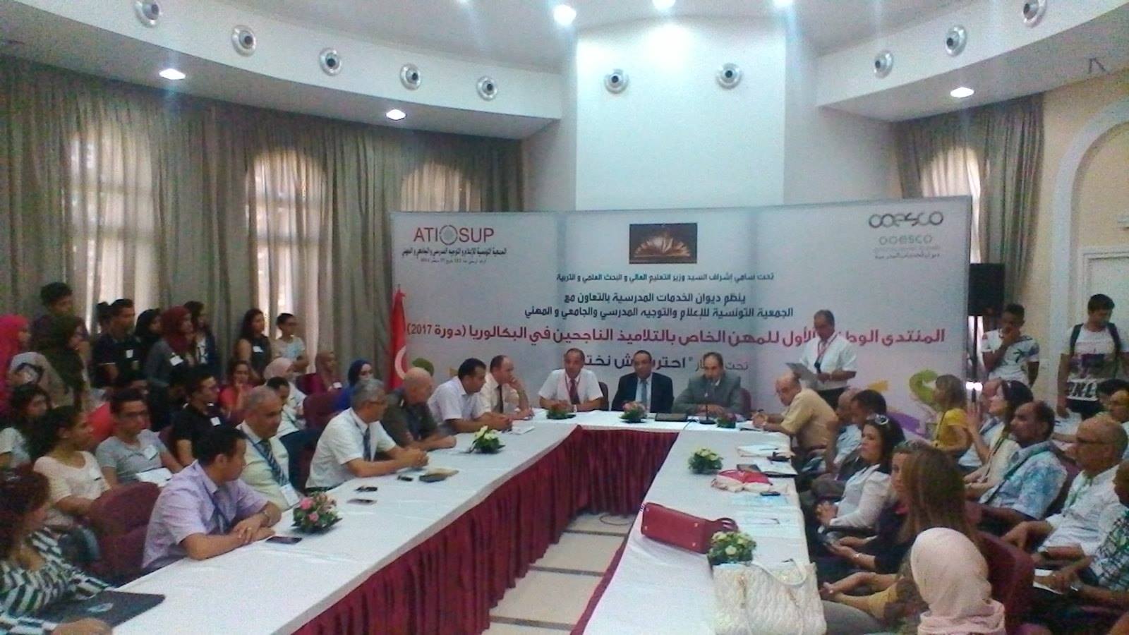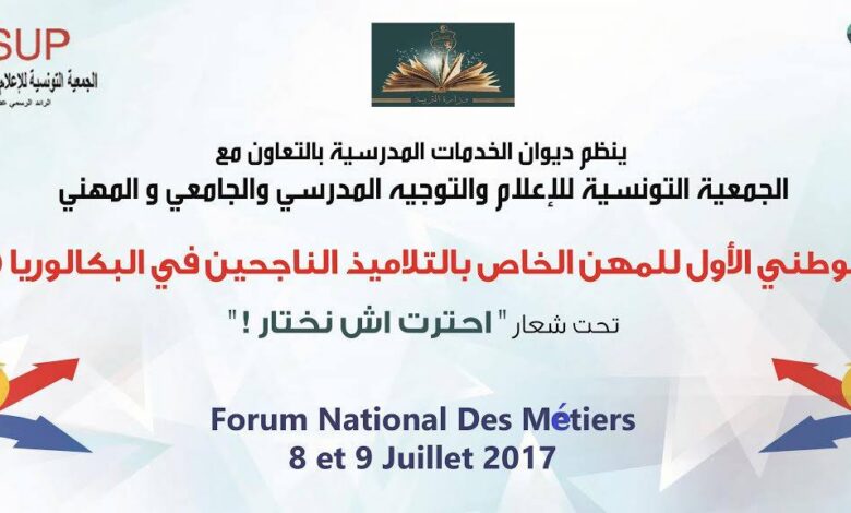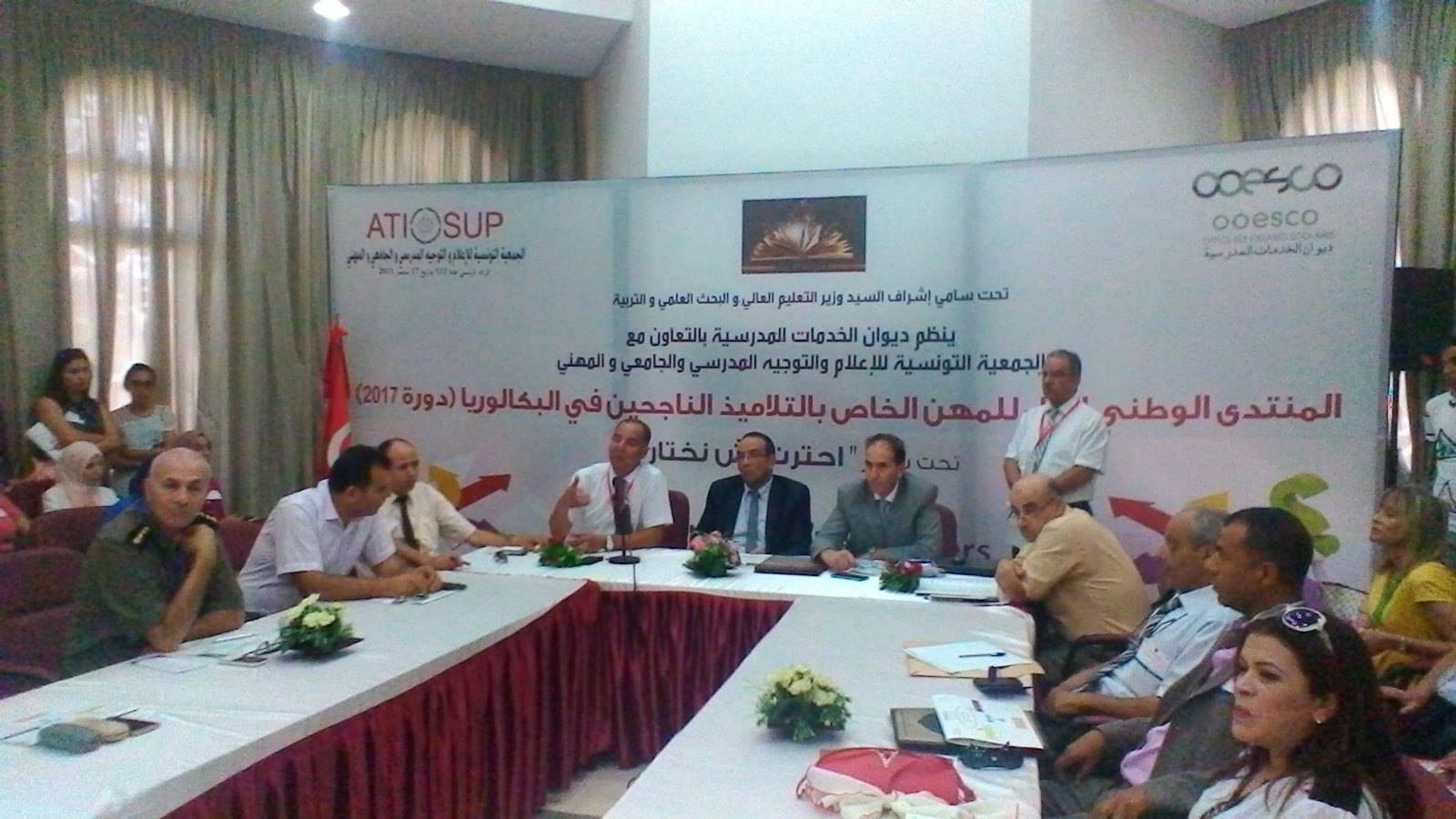 على الساعة الثامنة والنصف من اليوم السبت 08 جويلية 2017 تم افتتاح المنتدى الوطني الأول للمهن الخاص بالتلاميذ الناجحين في الباكالوريا (دورة 2017) من طرف مدير عام ديوان الخدمات المدرسية السيد سالم حرشاي تحت إشراف وزير التربية بالنيابة السيد سليم خلبوس . وبعد كلمات الافتتاح ووضع المنتدى في إطاره تم تقسيم البتلاميذ الناجحين وأوليائهم على ورشات عمل وتوجيه يشرف عليها خبراء الجمعية التونسية للإعلام والتوجيه المدرسي والجامعي والمهني. هذا وشهد المنتدى في يومه الأول مشاركة مجموعة من العارضين منهم وزارة الدفاع الوطني ووزارة التعليم العالي والبحث العلمي ووزارة السياحة والهيئة العليا للانتخابات والحماية المدنية وديوان الخدمات الجامعية والوكالة الوطنية للتكوين المهني والتشغيل.