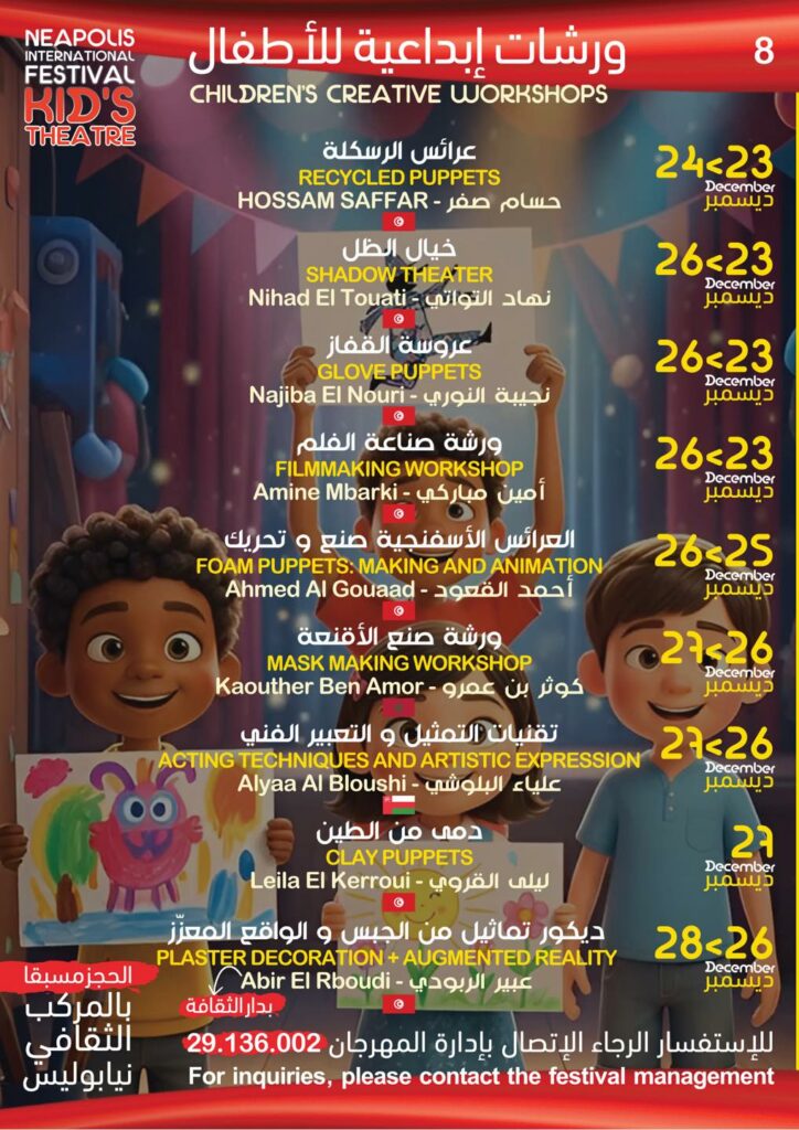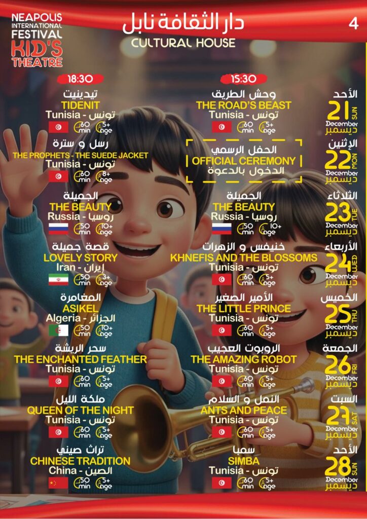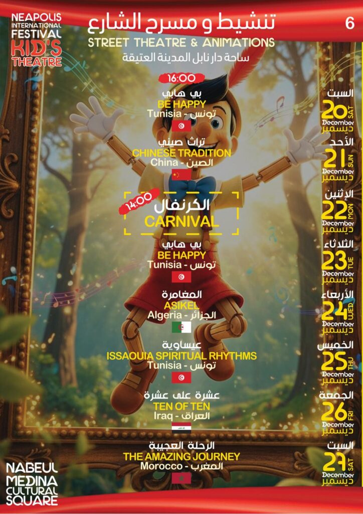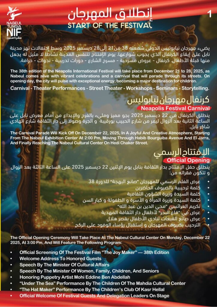 أعلنت الهيئة المديرة للدورة 38 لمهرجان نيابوليس لمسرح الطفل من 21 إلى 28 ديسمبر – نابل البرنامج التفصيلي للكرنفال …حسب الجدول التالي –