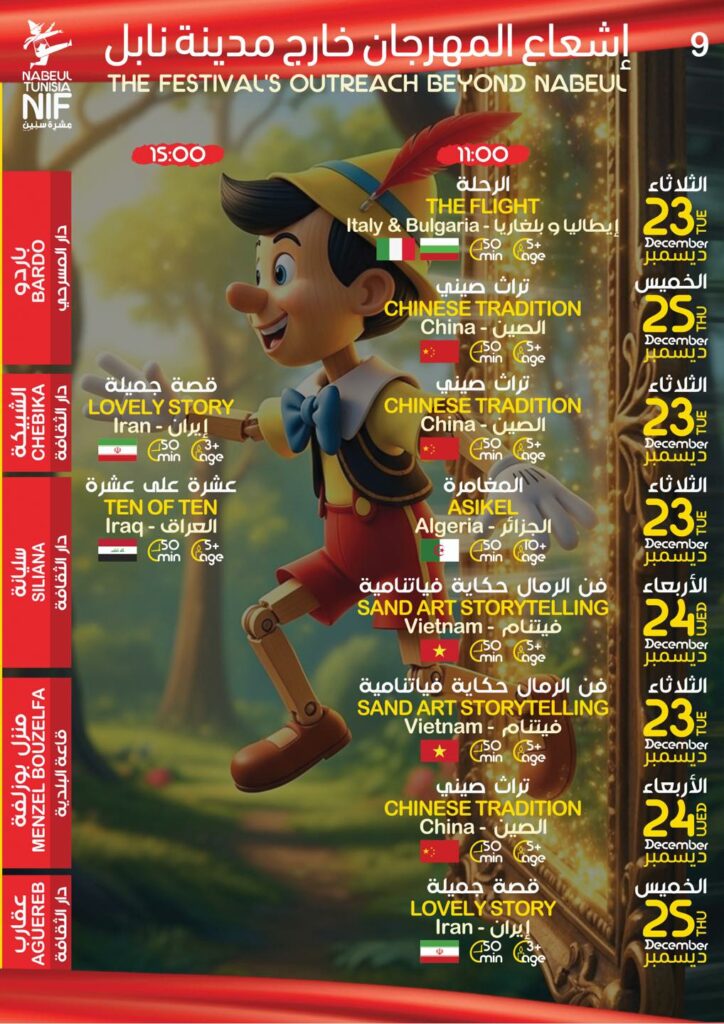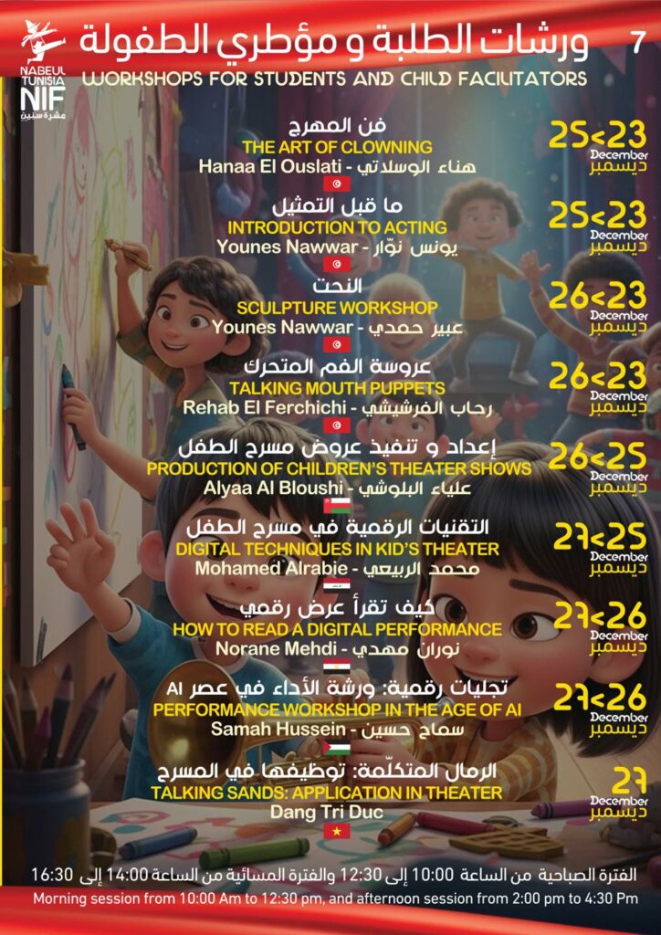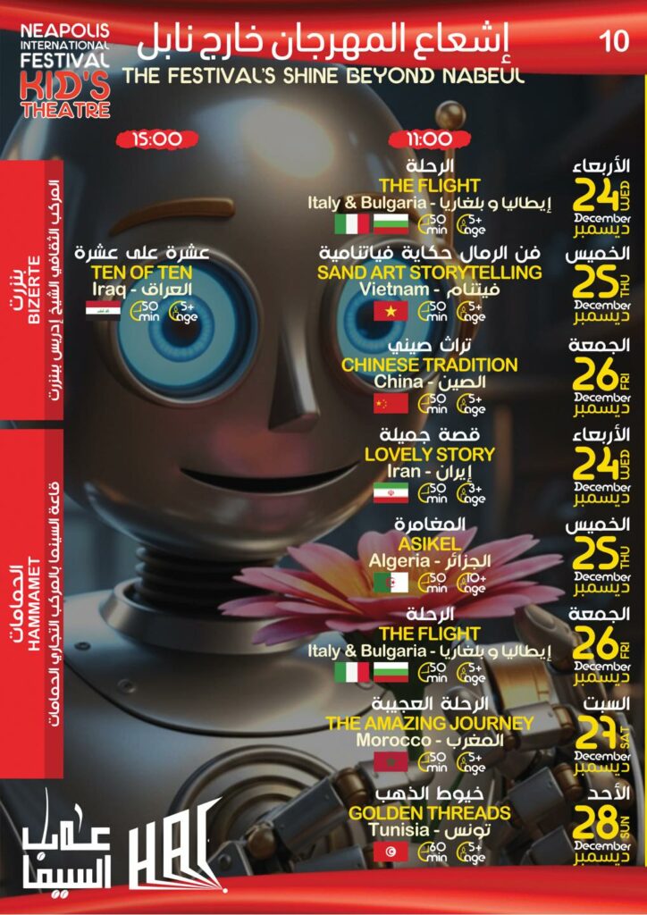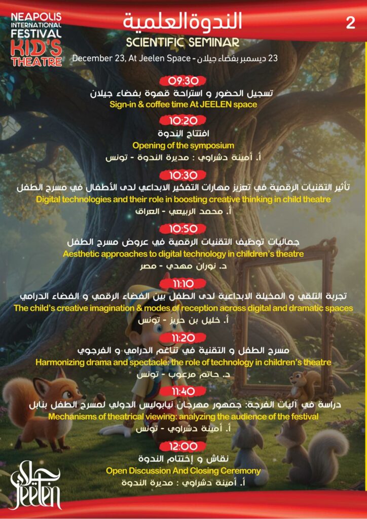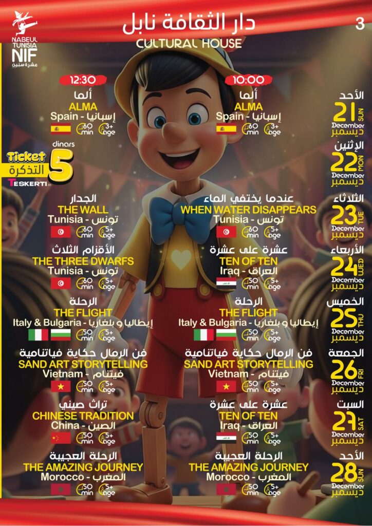 أعلنت الهيئة المديرة للدورة 38 لمهرجان نيابوليس لمسرح الطفل من 21 إلى 28 ديسمبر – نابل البرنامج التفصيلي للكرنفال …حسب الجدول التالي –