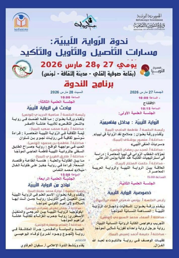 تحت إشراف وزارة الشؤون الثقافية، يُنظّم بيت الرواية بالتعاون مع اللجنة الوطنية اللّيبيّة للتربية والثقافة والعلوم ومسرح أوبرا تونس ندوة فكرية بعنوان: “الرّواية اللّيبيّة: مسارات التّأصيل والتّأويل والتّأكيد..” وذلك يومي 27 و28 مارس 2026 بقاعة صوفية القلي بمدينة الثقافة الشاذلي القليبي ويشارك في جلساتها العلمية ثلة من الأدباء الروائيين والنقاد والأكاديميين من تونس وليبيا وفق البرنامج المصاحب.