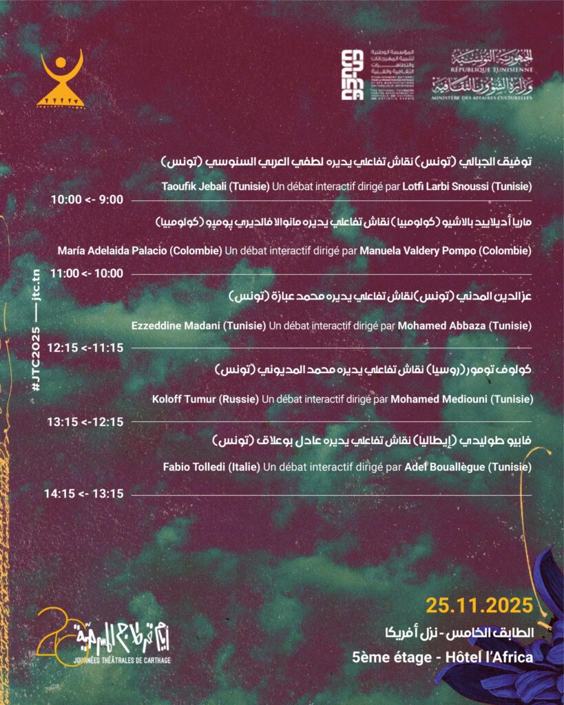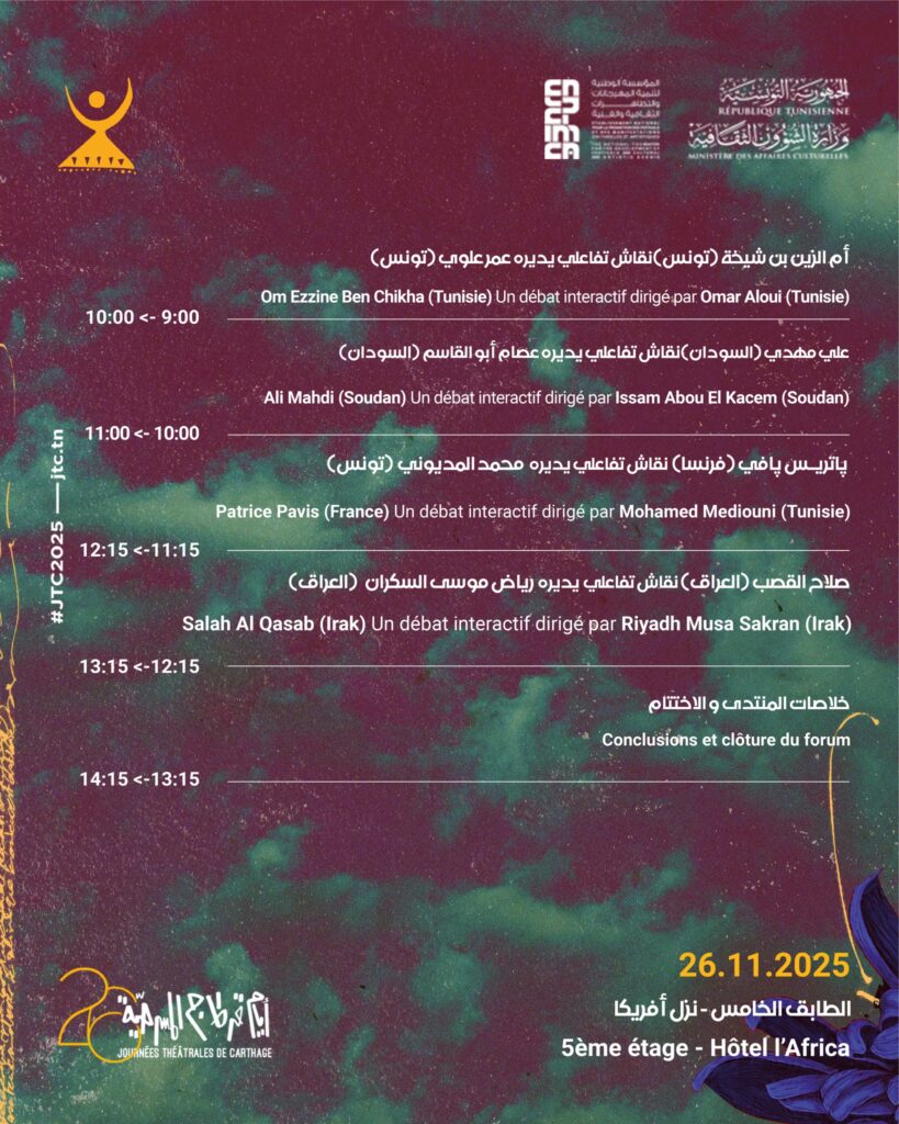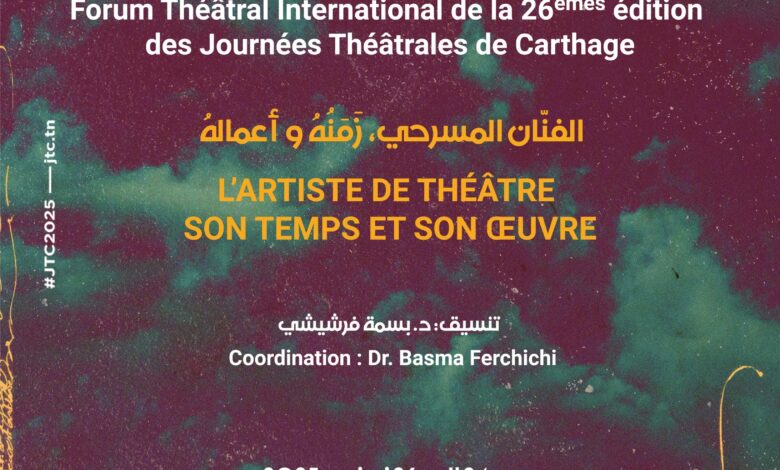 المنتدى المسرحي الدولي – الدورة 26 لمهرجان أيام قرطاج المسرحية 24–25–26 نوفمبر 2025 بالطابق الخامس لنزل إفريقيا