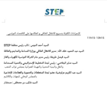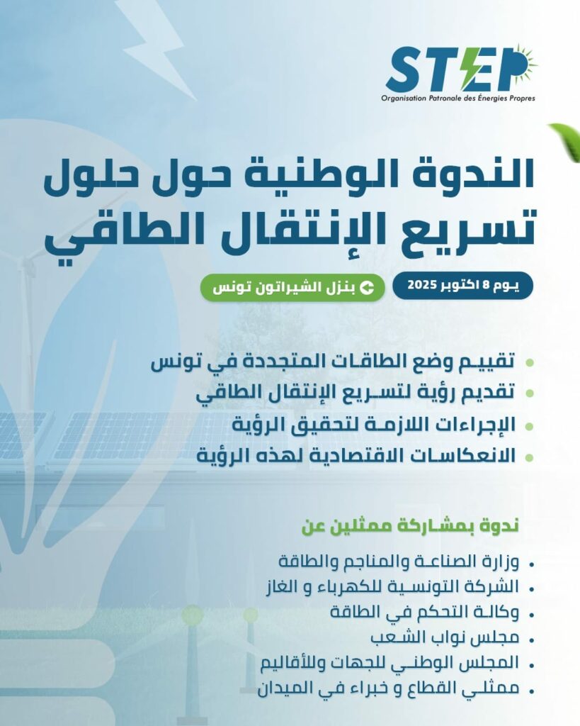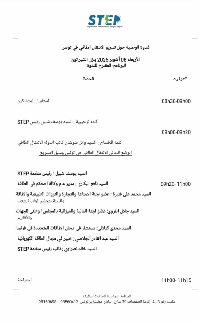 الندوة الوطنية حول ” تسريع الانتقال الطاقي في تونس ” الإربعاء 8 أكتوبر بنزل الشيراتون العاصمة 3 أيام مضت 52 زيارة صفا-نيوز/تونس تنتظم يوم الأربعاء 8أكتوبر 2025 ” الندوة الوطنية حول تسريع الانتقال الطاقي في تونس ” بنزل الشيراتون العاصمة وذلك ضمن البرنامج التالي / Tweet Share 0 Reddit +1 Pocket LinkedIn 0 2025-10-05 يسر بن يوسف