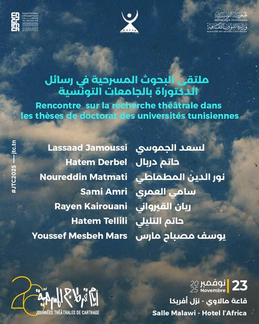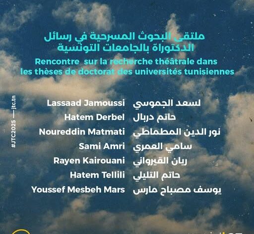 تحتضن الدورة 26 لأيام قرطاج المسرحية ملتقى البحوث في رسائل الدكتوراه بالجامعات التونسية، تقديم الدكتور الأسعد الجموسي.