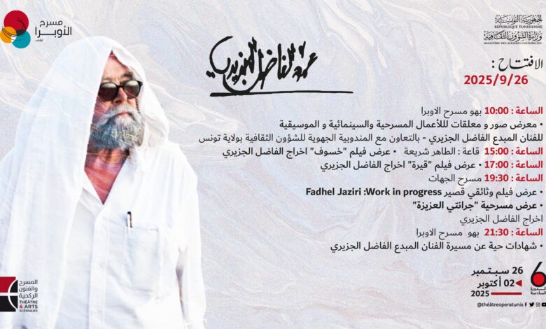 برنامج اليوم الجمعة – افتتاح تظاهرة “الخروج الى المسرح” – دورة الفنان الراحل الفاضل الجزيري”الخروج الى المسرح …الخروج الى الحياة….”