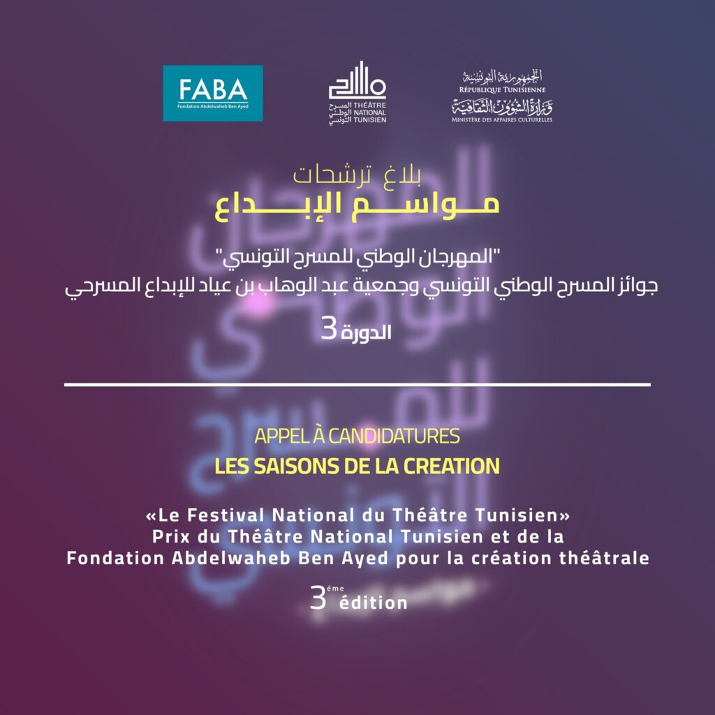 Le comité Directeur du Festival National du Théâtre Tunisien – Saisons de la création, organisé par le Théâtre National Tunisien sous l’égide du Ministère des Affaires Culturelles, et en partenariat avec la Fondation Abdelwaheb Ben Ayed, annonce la tenue de la – troisième édition des Prix du Théâtre National Tunisien et de la Fondation Abdelwaheb Ben Ayed du 01 au 07 novembre 2025, et l’ouverture des candidatures pour la participation comme suit :
