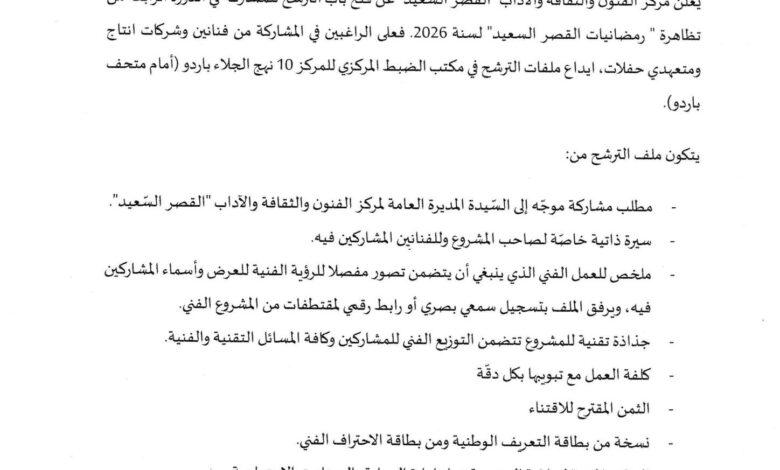 الرئيسية/أخبار ثقافية/بلاغ ترشحات للدورة الرابعة لتظاهرة رمضانيات ”القصر السعيد” لسنة 2026 أخبار ثقافية بلاغ ترشحات للدورة الرابعة لتظاهرة رمضانيات ”القصر السعيد” لسنة 2026 المحررمنذ يومين 122 أقل من دقيقة المحررمنذ يومين 122 أقل من دقيقة فيسبوك X لينكدإن مشاركة عبر البريد طباعة