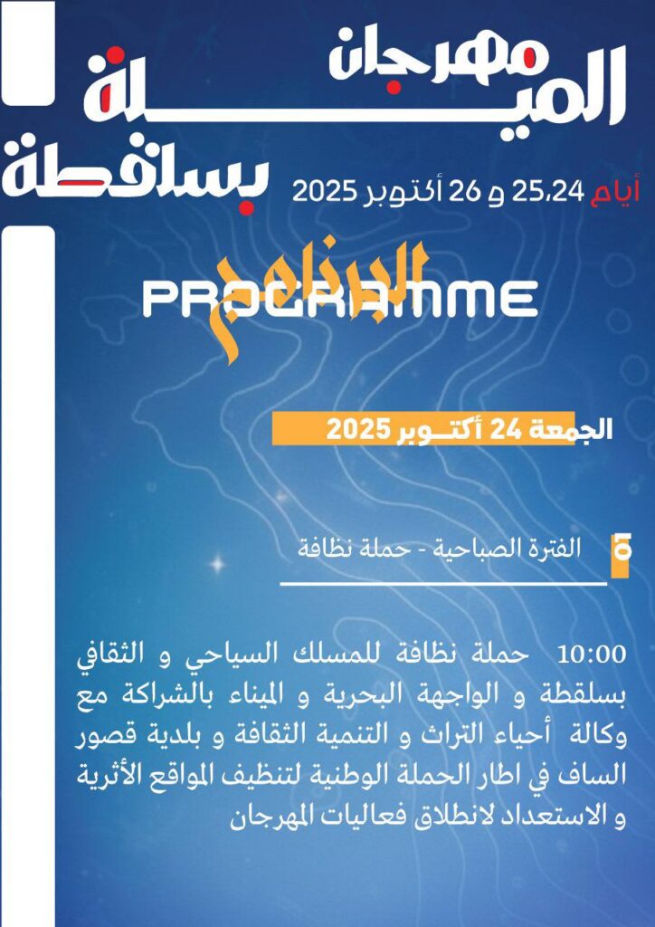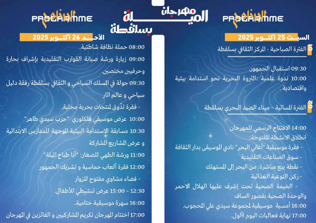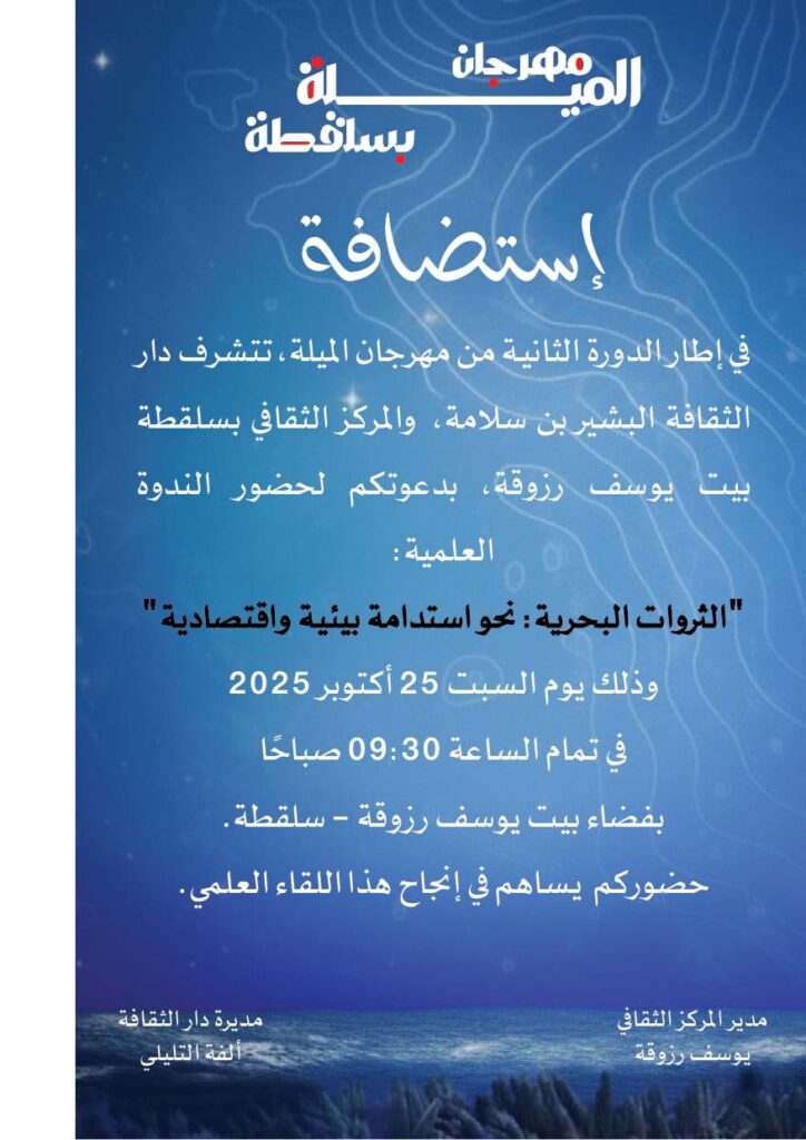 تحت اشراف المندوبية الجهوية للثقافة بالمهدية تنظم دار الثقافة البشير بن سلامة تظاهرة “مهرجان الميلة” وذلك يومي 25 و26 اكتوبر 2025 بسلقطة..
