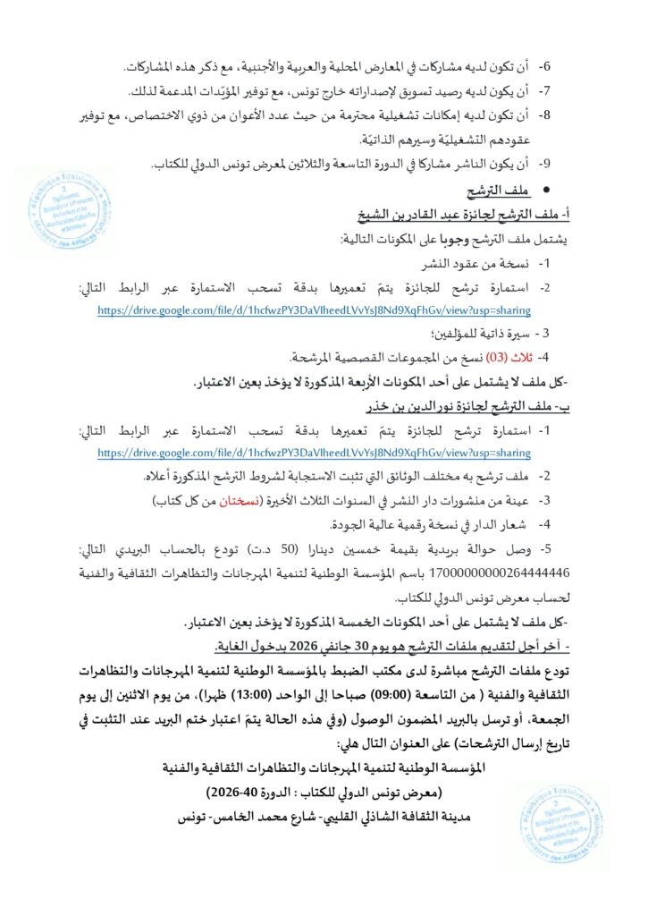 2- استمارة ترشح للجائزة يتمّ تعميرها بدقة تسحب الاستمارة عبر الرابط التالي: https://drive.google.com/…/1hcfwzPY3DaVIheedLVv…/view…