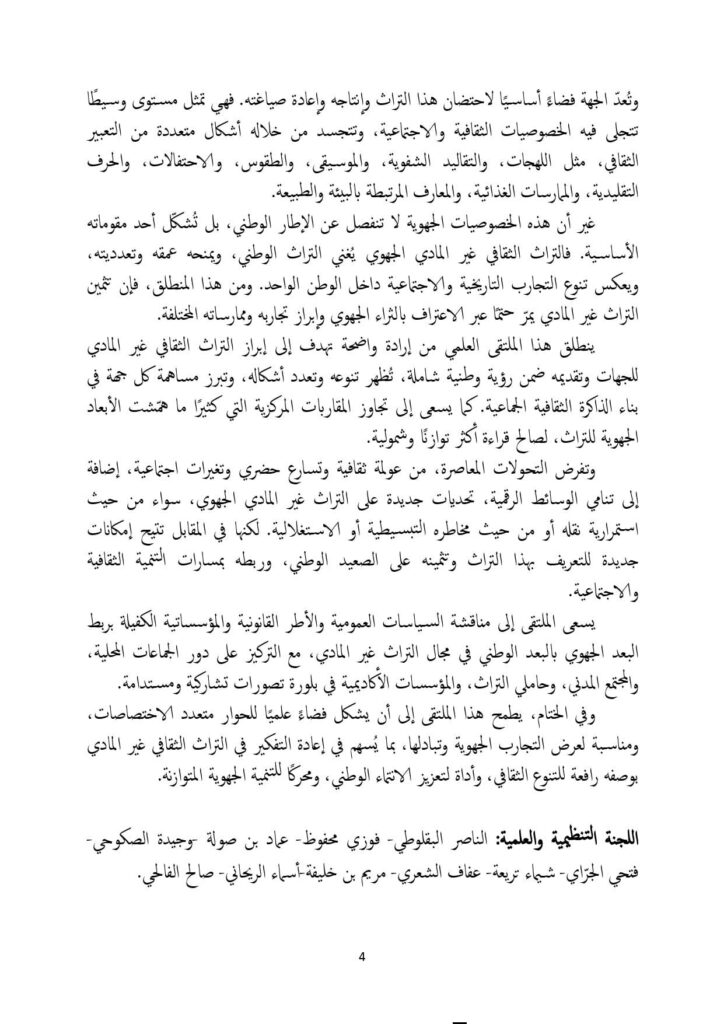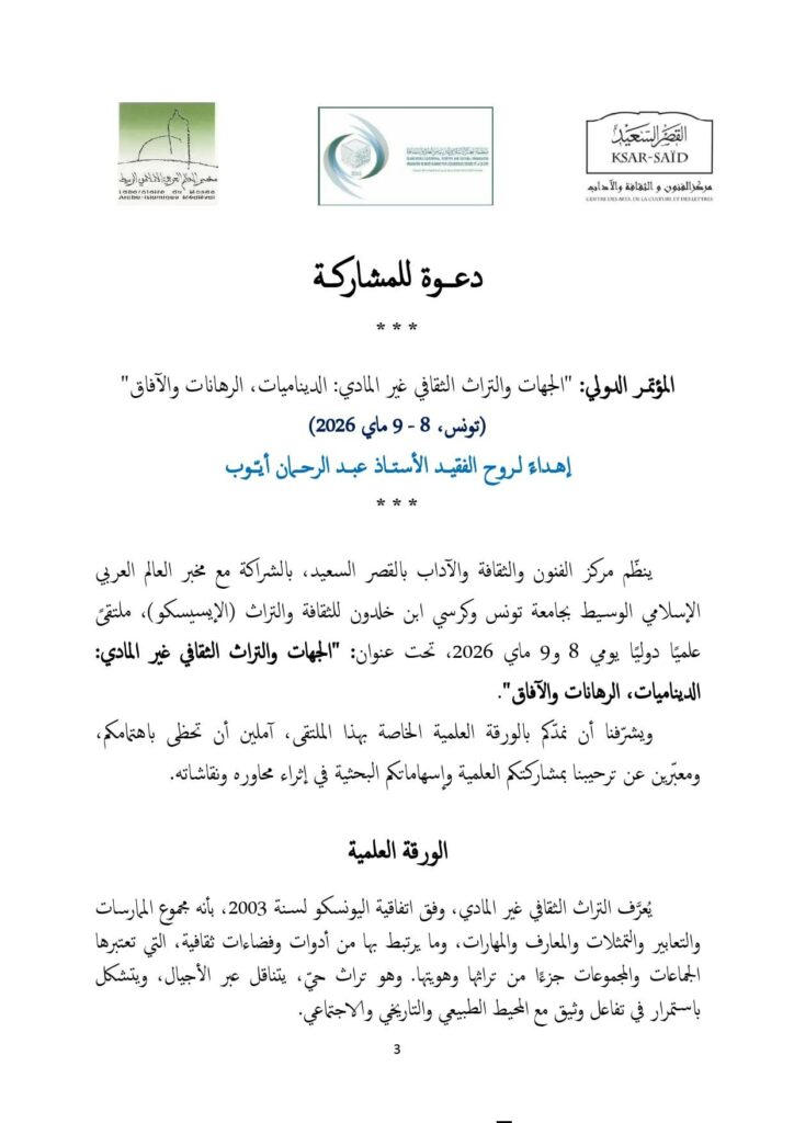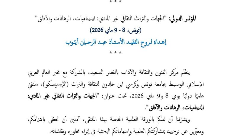 دعــوة للمشاركــة في المؤتمـر الدولي: “الجهات والتراث الثقافي غير المادي: الديناميات، الرهانات والآفاق”(تونس، 8 – 9 ماي 2026)