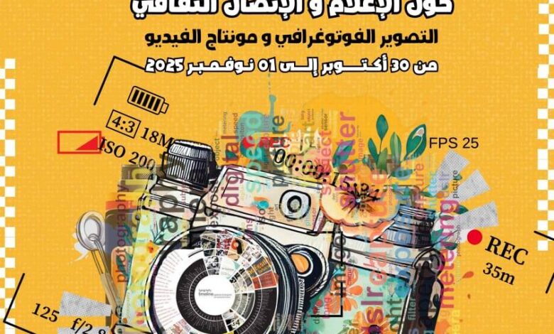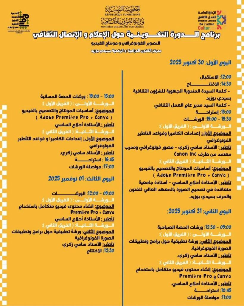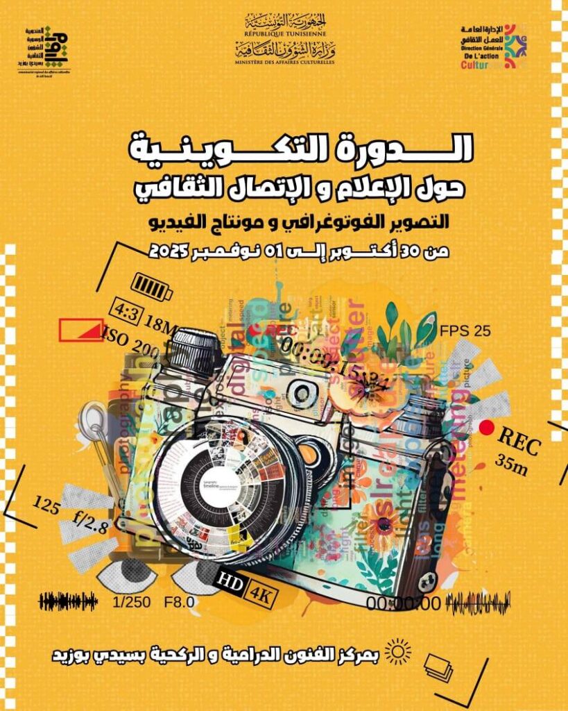 في إطار تطوير آليات العمل الإعلامي والإتصالي الجهوي وتحت اشراف وزارة الشؤون الثقافية، تنظم الإدارة العامة للعمل الثقافي بالتعاون مع المندوبية الجهوية للشؤون الثقافية بسيدي بوزيد دورة تكوينية في التصوير الفوتوغرافي ومونتاج الفيديو لفائدة أعوان المركبات الثقافية ودور الثقافة وذلك من 30 أكتوبر إلى 01 نوفمبر 2025 بمركز الفنون الدرامية والركحية بولاية سيدي بوزيد.