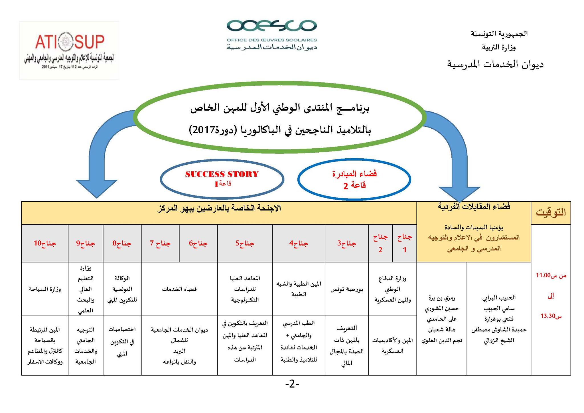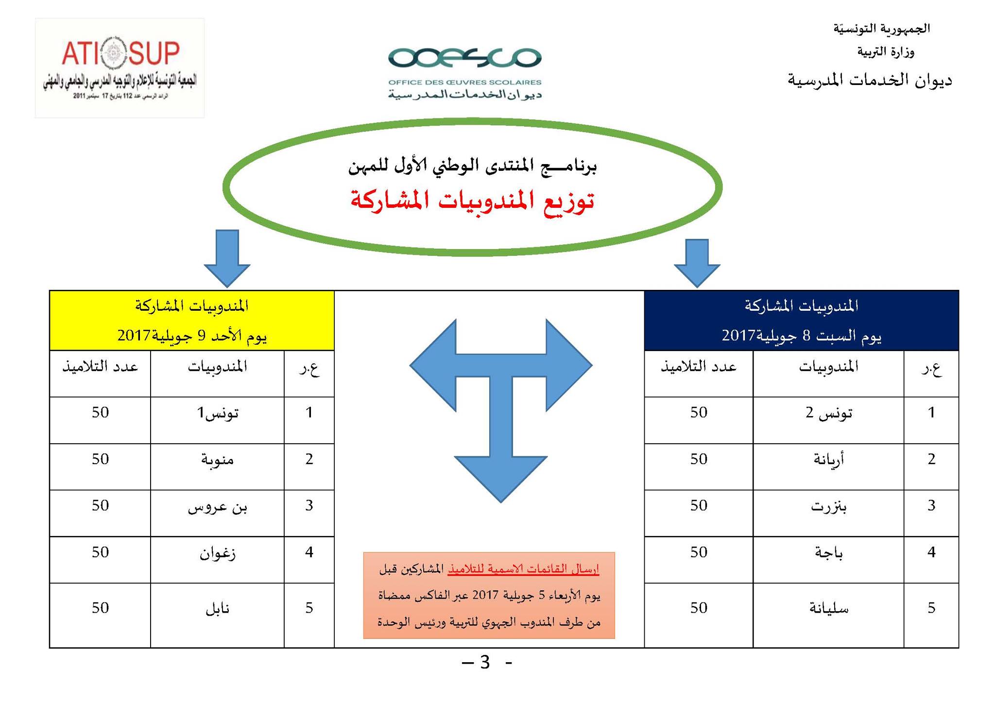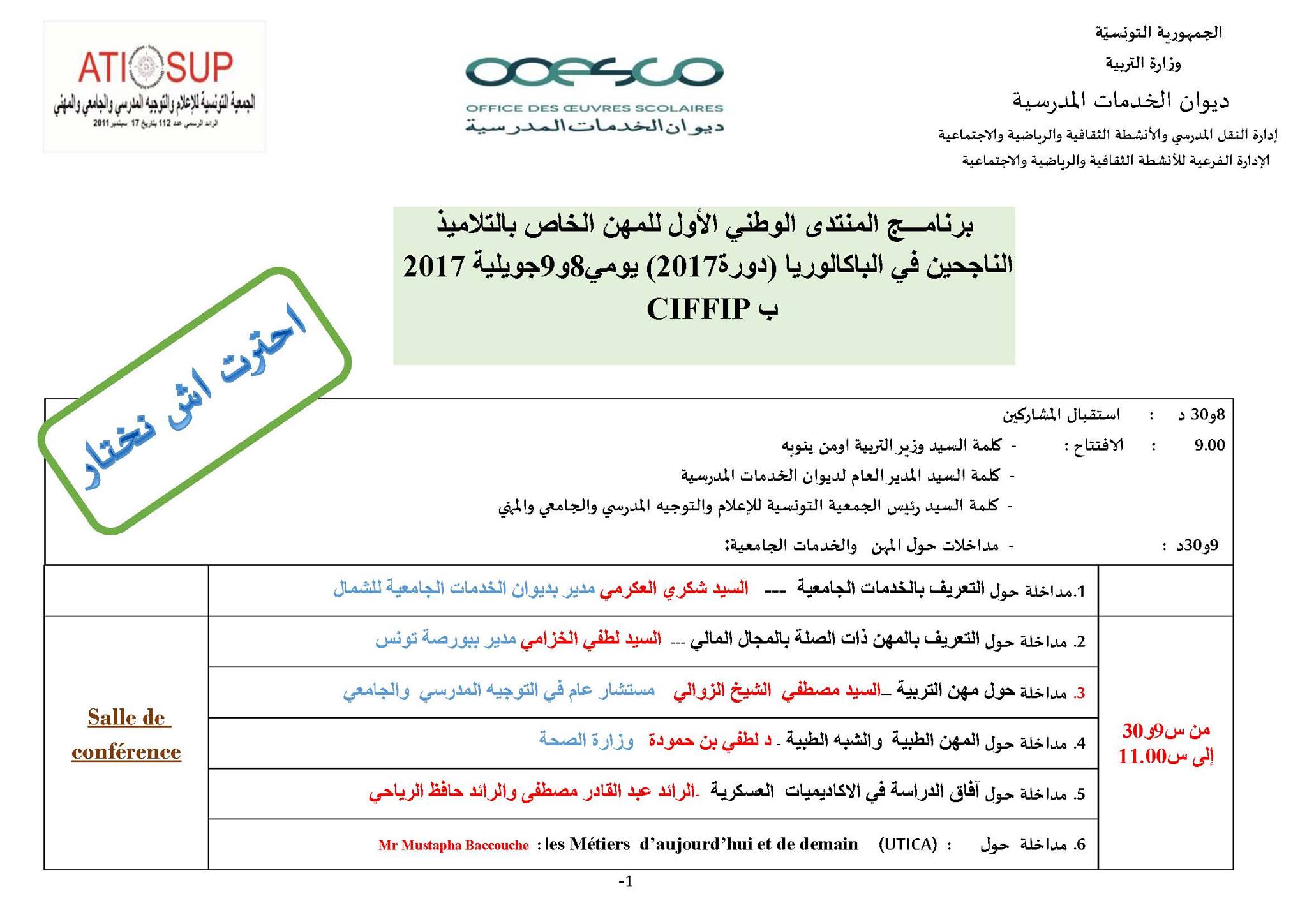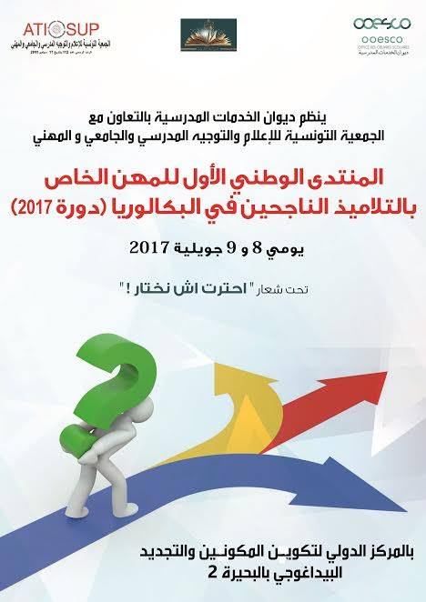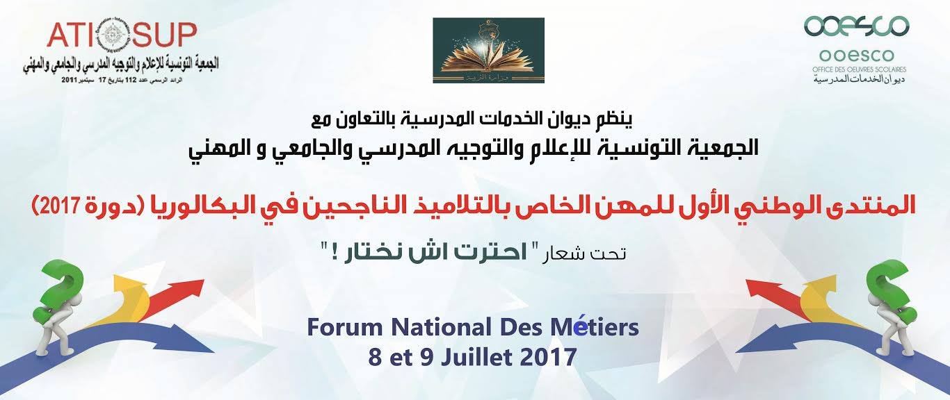 في إطار تنفيذ رزنامة التظاهرات والملتقيات الوطنية لوزارة التربية خلال السنة الدراسية 2016/2017 ، وبالتعاون مع المجتمع المدني ممثلا في الجمعية التونسية للإعلام والتوجيه المدرسي والجامعي والمهني ، وتحت إشراف وبرعاية سيادة وزيرالتعليم العالي والبحث العلمي ووزير التربية بالنيابة السيد سليم خلبوس ، ينظم ديوان الخدمات المدرسية المنتدى الوطني الأول للمهن الخاص بالتلاميذ الناجحين في الباكالوريا دورة 2017 وذلك خلال يومي08 و 09 جويلية 2017 بالمركز الدولي لتكوين المكونين والتجديد البيداغوجي بالبحيرة 2 .