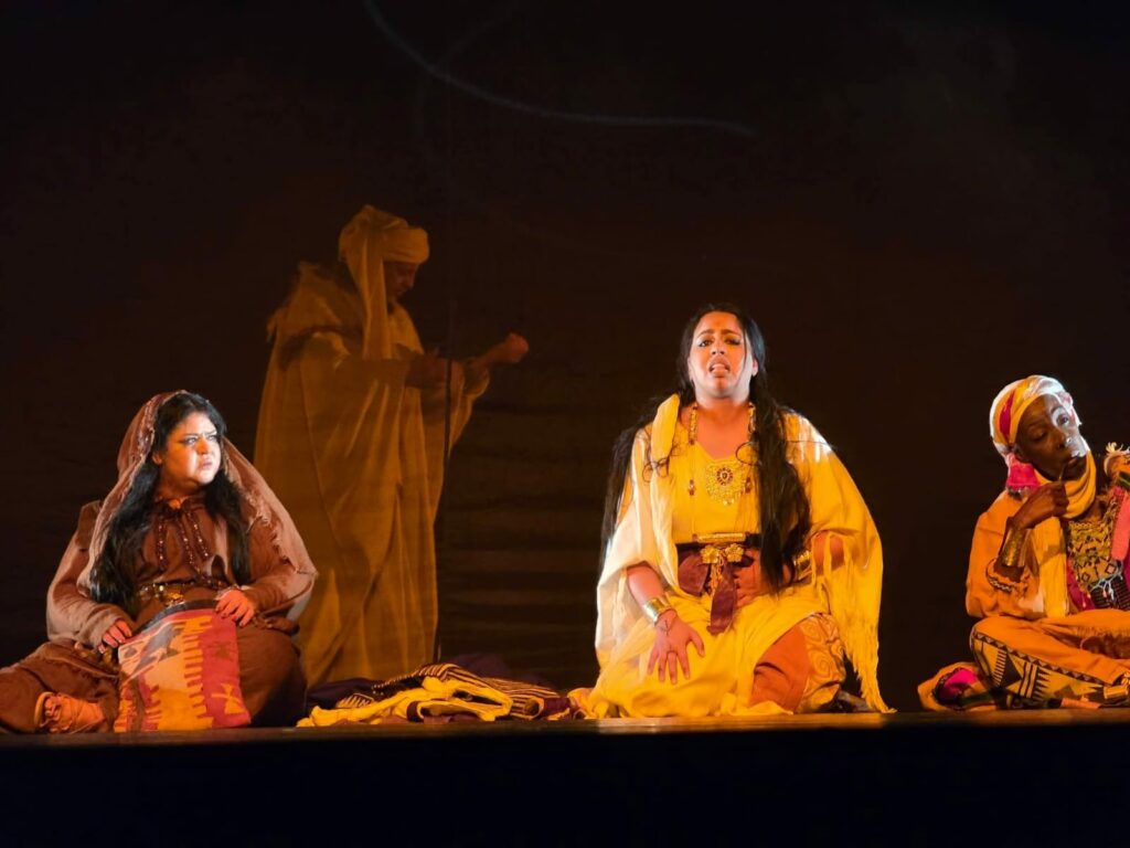 لهذا تم اعتماد الصحراء مكانا لاحداث المسرحية لما تحمله من سحر و غموض و شمول و انفتاح و عودة الى الانسانية الاولى و الى الذات المجردة للانثى و الرجل و الانسان عموما.