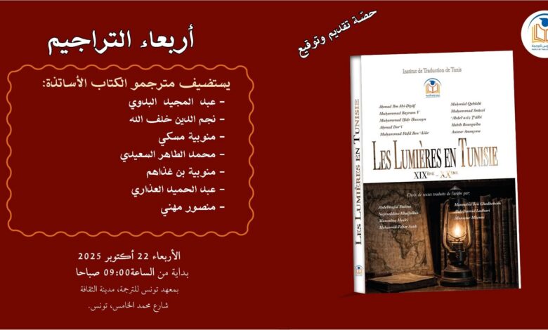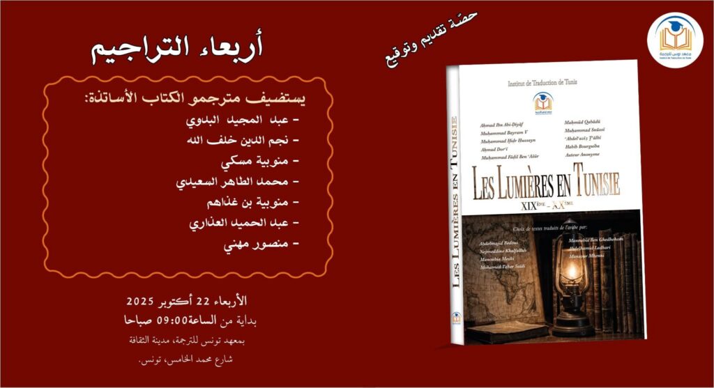 يستأنف معهد تونس للترجمة سلسلة أنشطته الدورية ضمن برنامج “أربعاء التراجيم”، من خلال لقاء جديد يُخصَّص لتقديم وتوقيع كتاب بعنوان “الفكر التنويري التونسي”، وذلك يوم الأربعاء 22 أكتوبر 2025 بداية من الساعة التاسعة صباحًا، بفضاء مكتبة بستان الألسن بمقرّ المعهد.