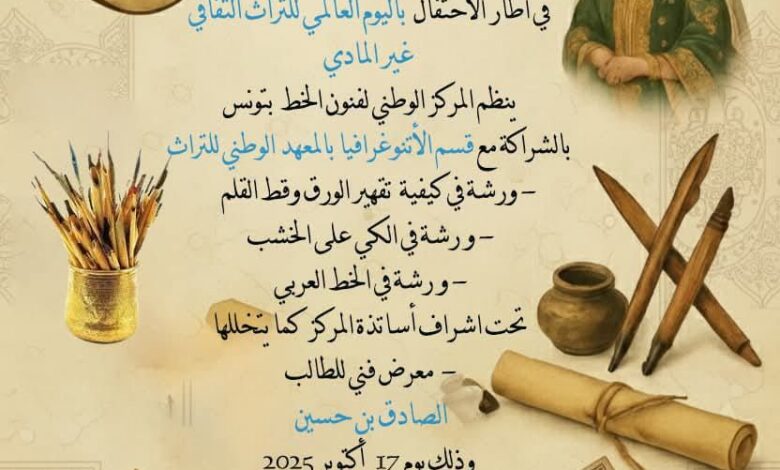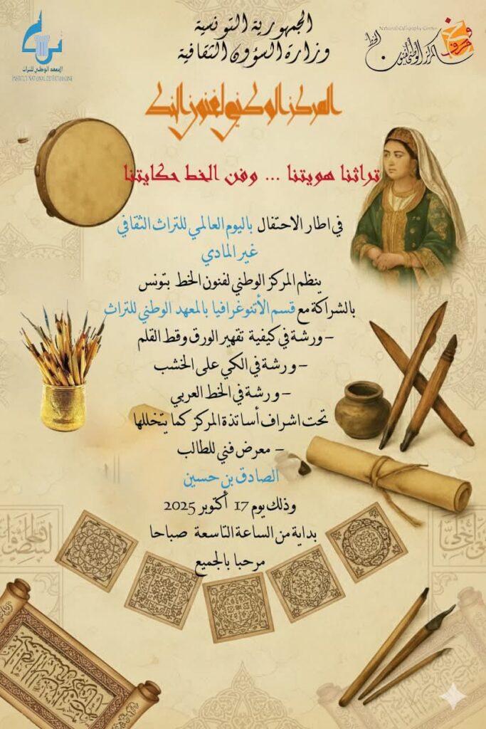 في إطار الإحتفال باليوم العالمي للتراث غير المادي وتحت إشراف وزارة الشــــــؤون الثقـــــــافية، ينظّم المركز الوطني لفنون الخّط بالشراكة مع قسم الأثنوغرافيا بالمعهد الوطني للتراث تظاهرة بعنوان