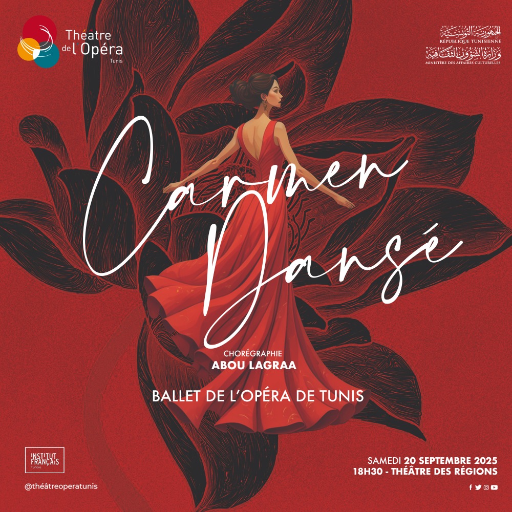 تحت اشراف وزارة الشؤون الثقافية، ينظم مسرح أوبرا تونس عرض “كارمن الراقص” كوريغرافيا أبو لقرع أداء باليه أوبرا تونس وذلك يوم السبت 20 سبتمبر 2025 الساعة السادسة و نصف مساء بمسرح الجهات بمدينة الثقافة الشاذلي القليبي.