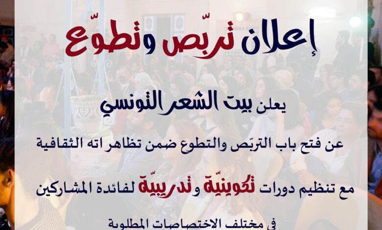 يُعلن بيت الشعر التونسي عن فتح باب الترشّح أمام الرّاغبين في التربّص والتطوّع ضمن مختلف أنشطته وتظاهراته في المجالات التالية: