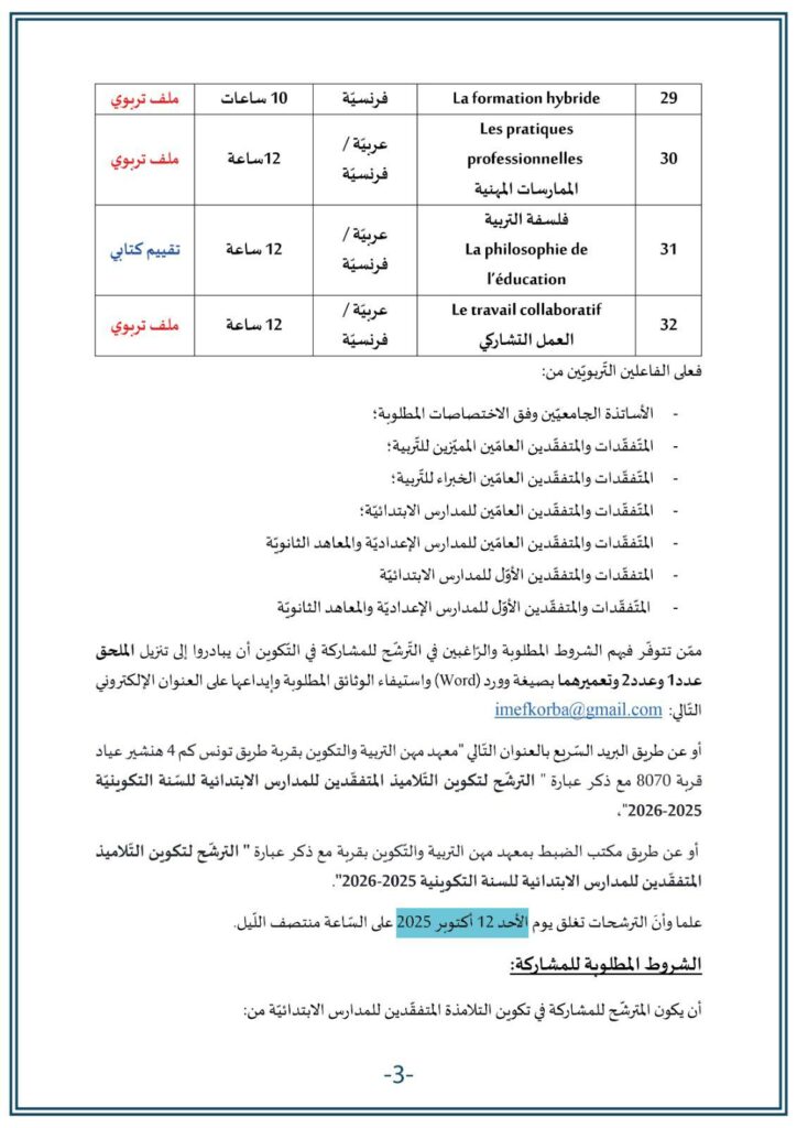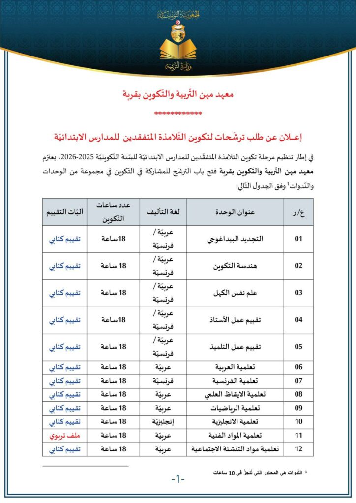 معهد مهن التربية والتكوين بقربة/إعلان عن طلب ترشّحات لتكوين التلاميذ المتفقدين للمدارس الابتدائية 2025/2026
