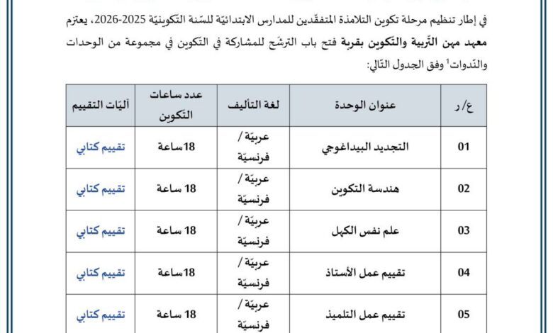 الرئيسية/أخبار وطنية/معهد مهن التربية والتكوين بقربة/إعلان عن طلب ترشّحات لتكوين التلاميذ المتفقدين للمدارس الابتدائية 2025/2026 أخبار وطنية معهد مهن التربية والتكوين بقربة/إعلان عن طلب ترشّحات لتكوين التلاميذ المتفقدين للمدارس الابتدائية 2025/2026 سميرة الخياري كشو27 سبتمبر 2025 396 أقل من دقيقة سميرة الخياري كشو27 سبتمبر 2025 396 أقل من دقيقة فيسبوك X لينكدإن مشاركة عبر البريد طباعة