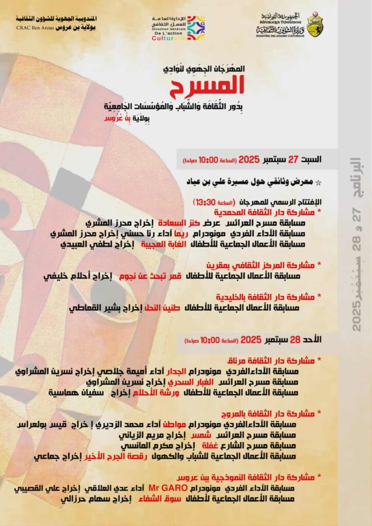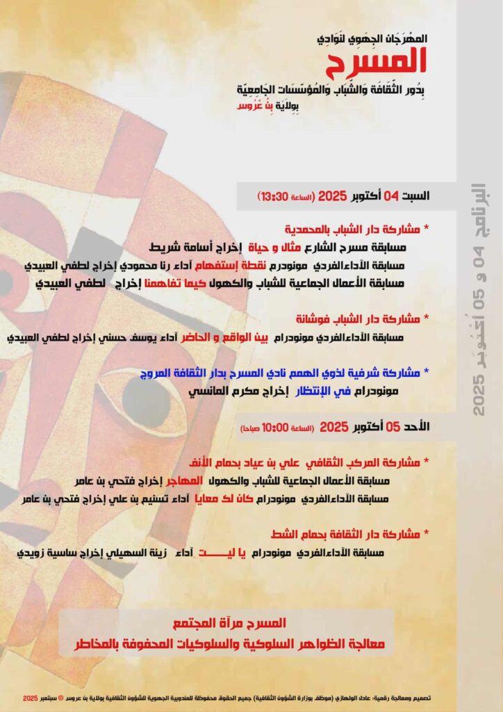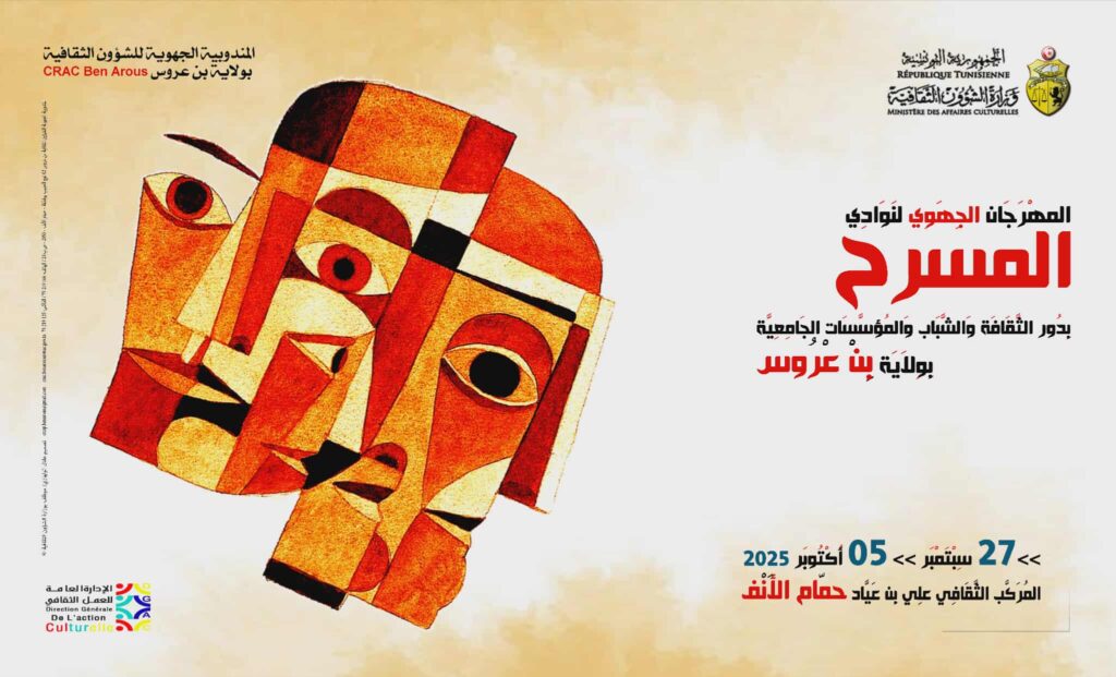 ، تنظم المندوبية الجهوية بولاية بن عروس من27 سبتمبر إلى 05 أكتوبر 2025 المهرجان الجهوي بالمركب الثقافي علي بن عياد بحمام الأنف.