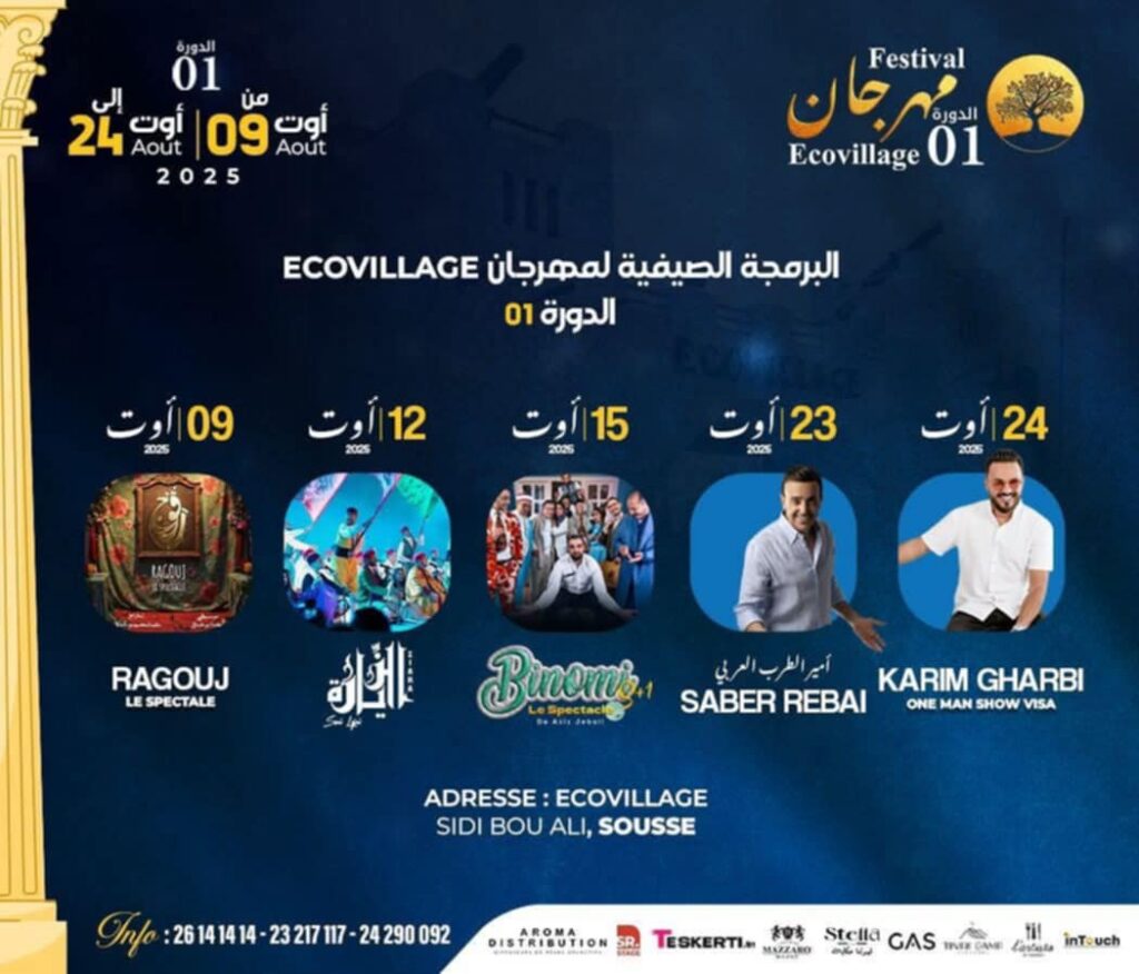 تحتضن مدينة سوسة فعاليات الدورة الأولى لمهرجان إيكوفيلدج ECOVILLAGE وذلك من من 9 إلى 24 أوت2025 .