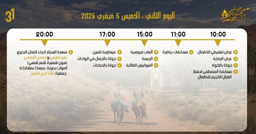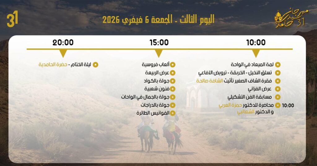 المهرجان يفتح ابوابه يوم الاربعاء القادم الموافق ل اربعة فيفري و يتواصل الي السادس من فيفري و يستهل برنامجه بعدة فقرات ثقافية حيث سنجد الرسم و الطبخ و المسرح و الفن الصوفي و تسلق النخيل و تسابق الجمال و الغناء و ايضا سيكون هناك معرض للصناعات التقليدية و ايضا حضور ملفت لعادات و تقاليد المنطقة كل التفاصيل موجودة في البرنامح .