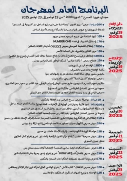 مهرجان ”مجدي عبرود” بالمكنين من تنظيم جمعية ”روافد للفن المسرحي” من 19 الى 23 نوفمبر 2025