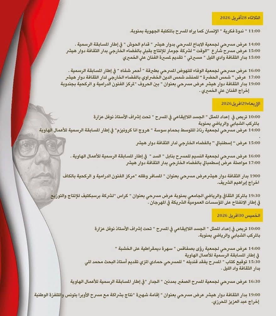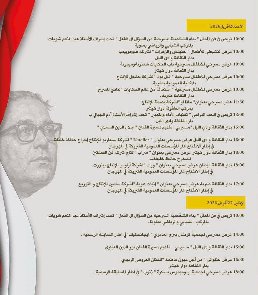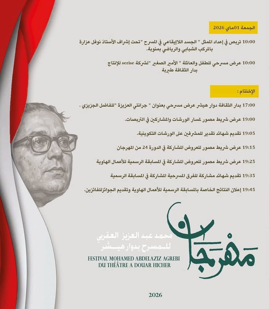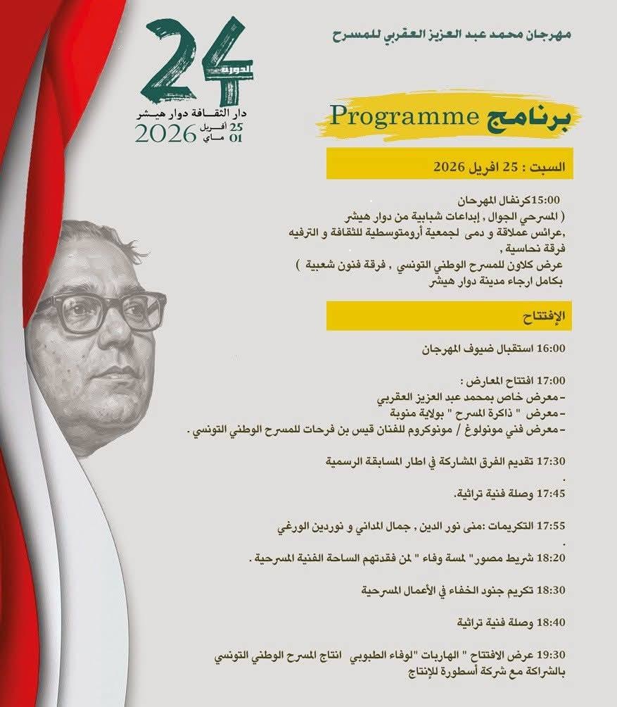 ينطلق مهرجان محمد عبد العزيز العقربي للمسرح هذه التظاهرة المسرحية العريقة التي تحتضنها دار الثقافة دوار هيشر من 25 أفريل إلى غرة ماي 2026 تحت إشراف وزارة الشؤون الثقافية.