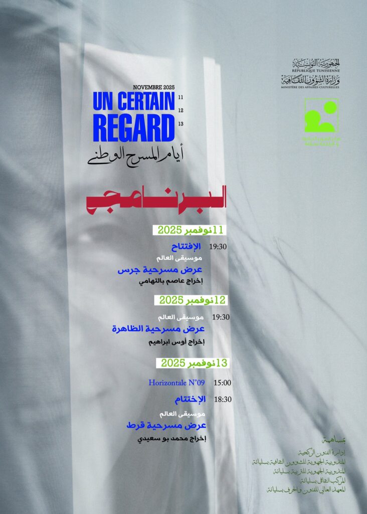 مهرجان “نظرة ما ‘’ Un Certain regard’’ – أيام المسرح الوطني من 11 الى 13 نوفمبر 2025 هو مولود جديد في دورته الثانية من تنظيم مركز الفنون الدرامية والركحية بسليانة الذي ما فتئ يسعى الى كسر الفجوة الثقافية بين الجمهور والثقافة من خلال تظاهرات متعددة ومختلفة طيلة السنة .